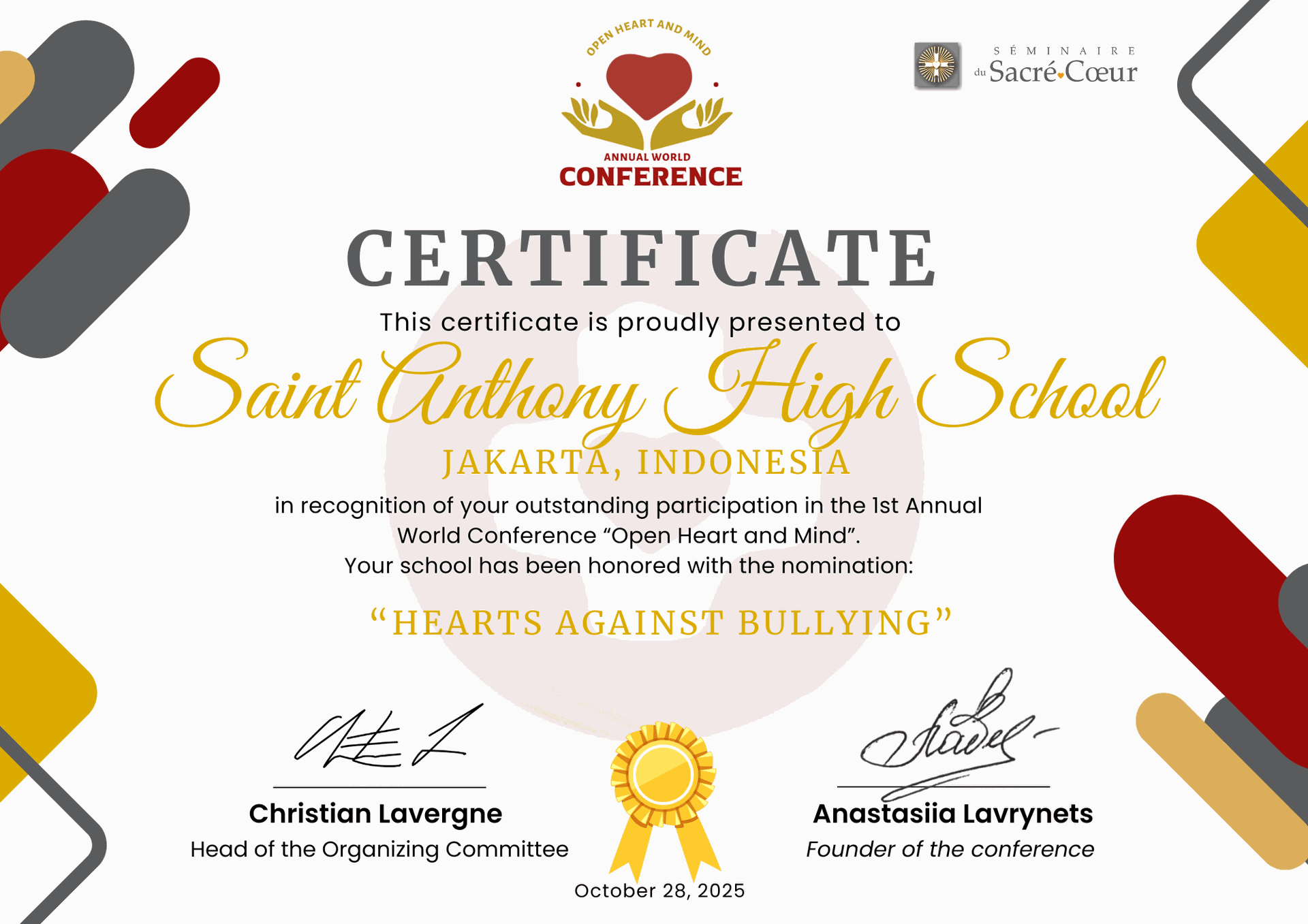 Selasa, (28/10/2025), SMA Santo Antonius baru saja berpartisipasi dalam acara Dehonian International Conference, bertajuk "Open Heart Open Mind" dengan tema "Love In Action: Creating Tomorrow's World". SMA Santo Antonius Jakarta mengutus 5 anak untuk berpartisipasi dalam kegiatan tersebut, diantaranya; Tara Michelle Everdine Kadengkian (XII F2), Theresia Almeda Wulandari (XII F4), Michelle Tania (XII F4), Jovan Haryanto (XII F3), dan Yohanna Samantha Claasen (XI F1). Kegiatan ini dilaksanakan secara online, mengingat pertemuan ini diikuti oleh semua sekolah dehonian di dunia, diantaranya dari Indonesia itu sendiri (SMA Santo Antonius Jakarta dan SMA Yos Sudarso Lampung), Kanada, Brazil, Madagaskar, Chile dan negara lainnya yang dibawah naungan romo- romo SCJ. Kegiatan ini berlangsung pada pukul 19.00 WIB - 22.00 WIB, mengikuti zona waktu negara penyelenggara, Kanada. Anak- anak SMA Santo Antonius sangat antusias dalam mengikuti acara tersebut, terlihat dari pukul 18.00 WIB mereka sudah berkumpul di sekolah.
