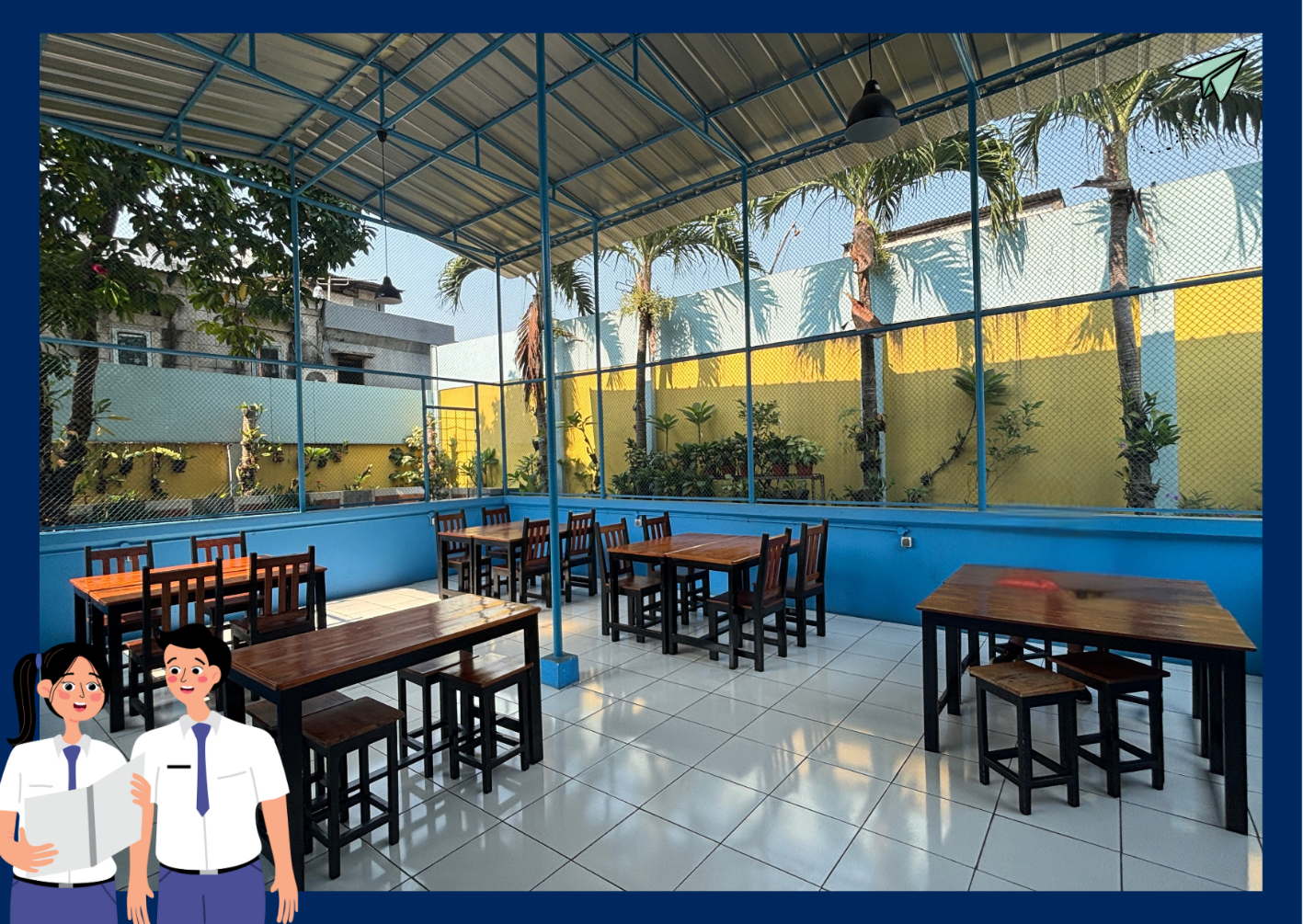 Kantin sekolah merupakan ruang yang nyaman dan bersih, dengan tiga stand makanan yang menyajikan berbagai pilihan menu. Penataannya dirancang sedemikian rupa sehingga dapat menampung banyak siswa.